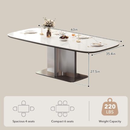 63″ Modern Sintered Stone Dining Table for 6, Glossy White Rectangular Kitchen Table with Wood-Reinforced Top & Metal Pedestal Base, for Standard Dining Room, Kitchen & Family Gatherings
