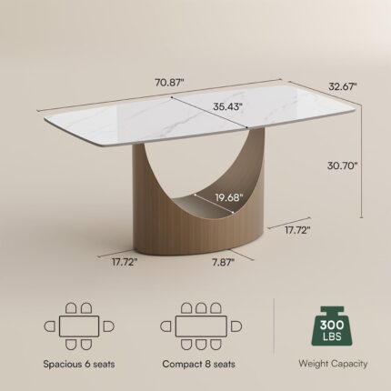 71″ Sintered Stone Dining Table for 6, Rectangular Kitchen Table with Solid Wood Pedestal, Luxury Mid Century Modern Dinner Table for Dining Room