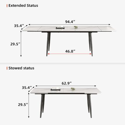 62.9″-94.4″ Modern Extendable Dining Table for 6 to 10 Seats, Rectangular Sintered Stone Table with High Hardness and Easy Maintenance for Dining Room Family Gathering, White Top