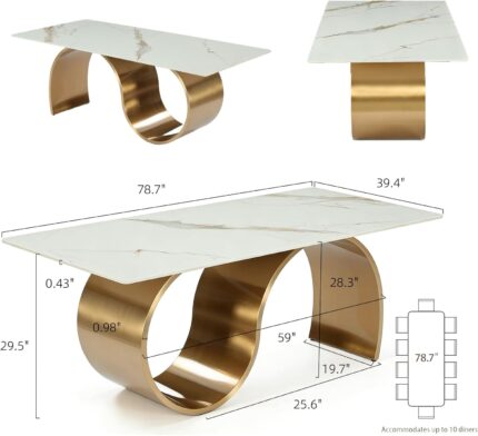 79″ Sintered Stone Dining Table for 6-8, Luxury Rectangular Kitchen Table with Stainless Steel Base, Large Stone Dining Room Table for Living Room, White and Gold
