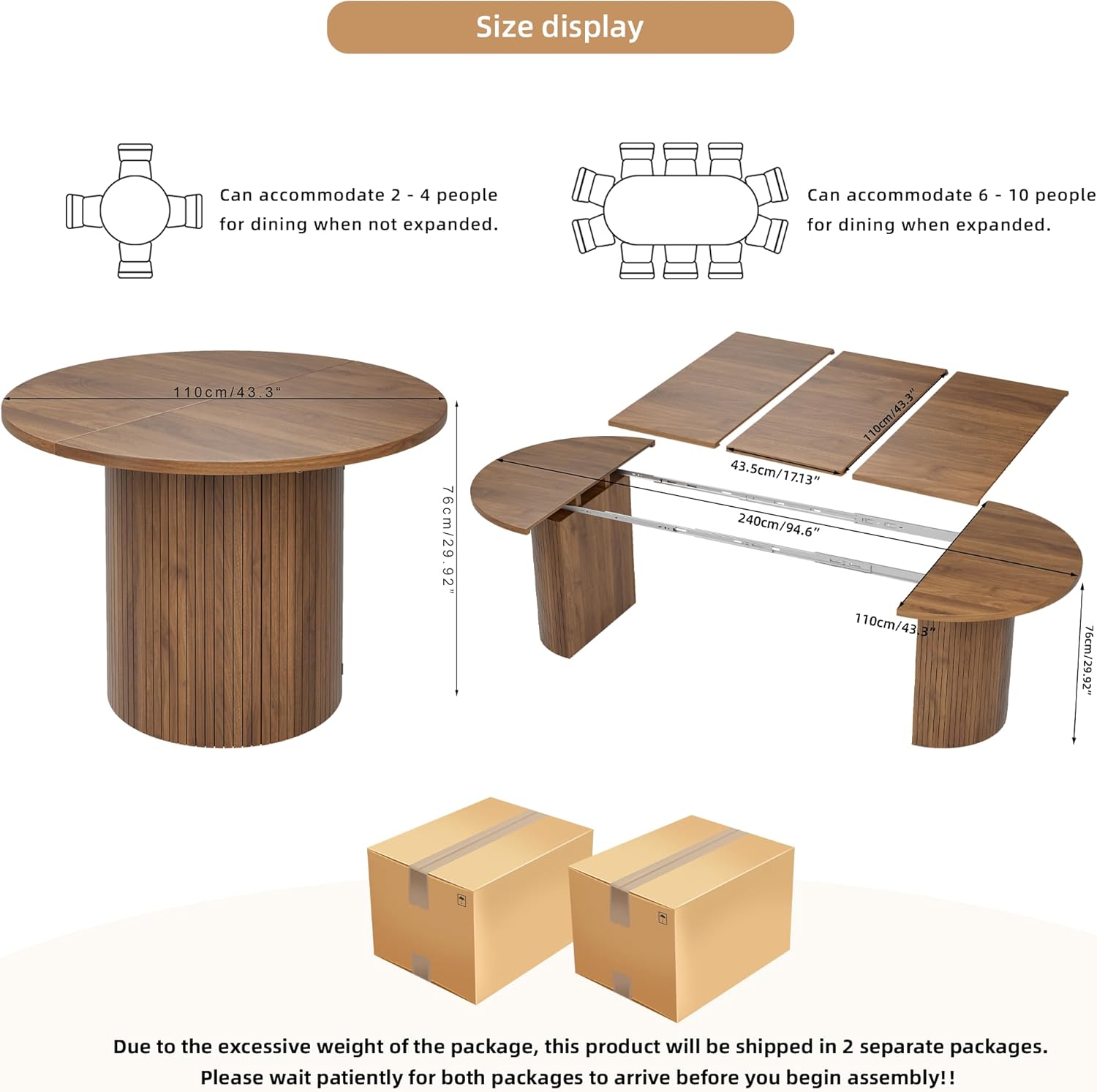 43-95 Inch Long Round Extendable Dining Table for 4-10, Space Saving Oval Large Dinner Kitchen Table with 3 Leaf, 2 Storage, Fluted Mid Century Modern Dining Room Table for Living Room, Walnut