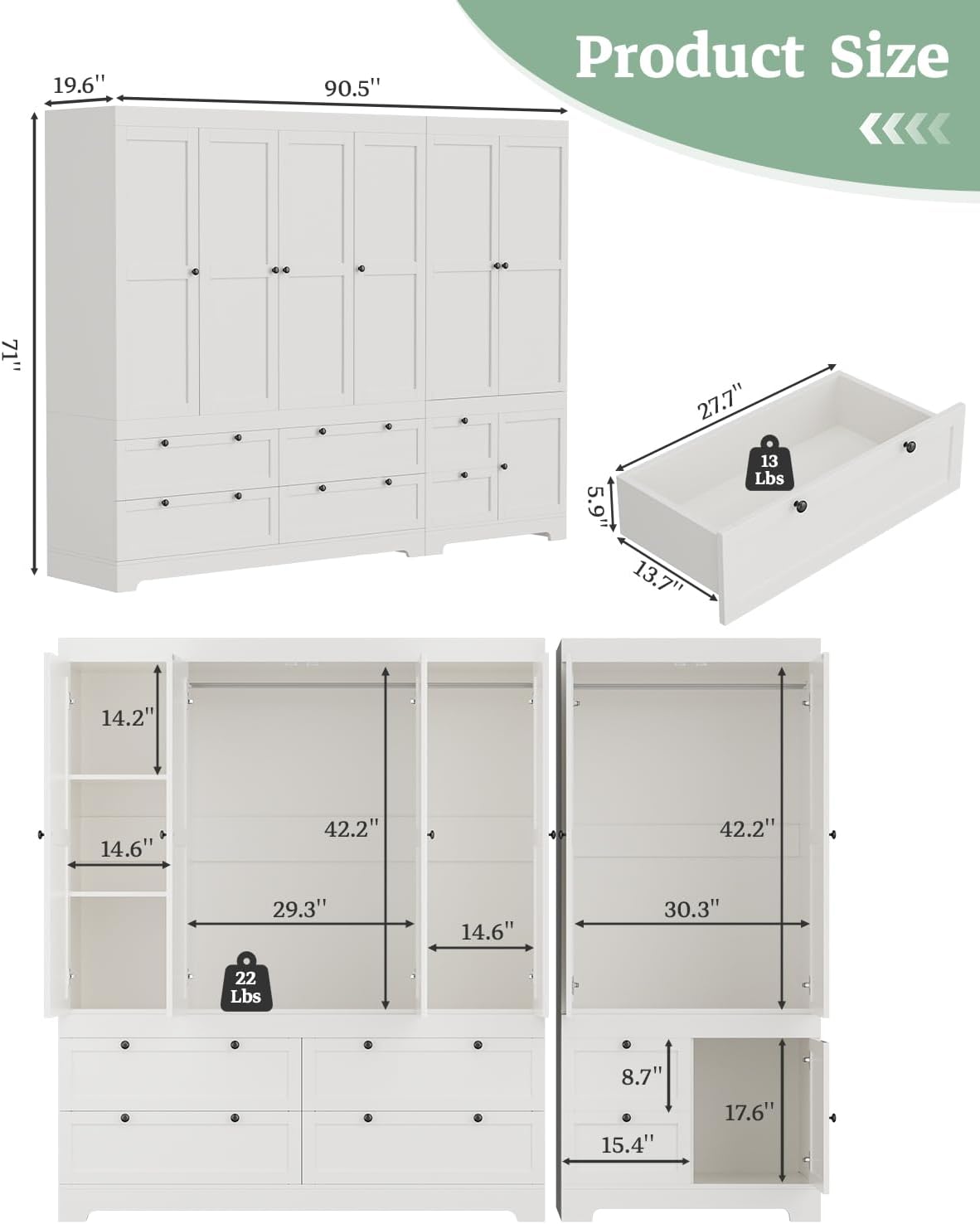 6 Door 71″ Tall Wardrobe Closet – White Wooden Freestanding Storage Armoire – Large Capacity Modular Cabinet with Drawers, Space-Saving Durable Design for Bedroom & Closet Organization