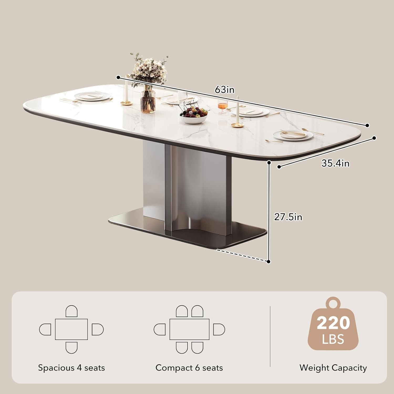 - [STUNNING MODERN CENTERPIECE] Elevate your dining space with a premium 63″ x 35.4″ glossy white sintered stone tabletop. Featuring elegant, natural marble veining and a sleek profile, this rectangular dining table seamlessly blends contemporary luxury with everyday practicality. The heavily rounded safety corners prevent accidental bumps, offering peace of mind for households with children or pets.