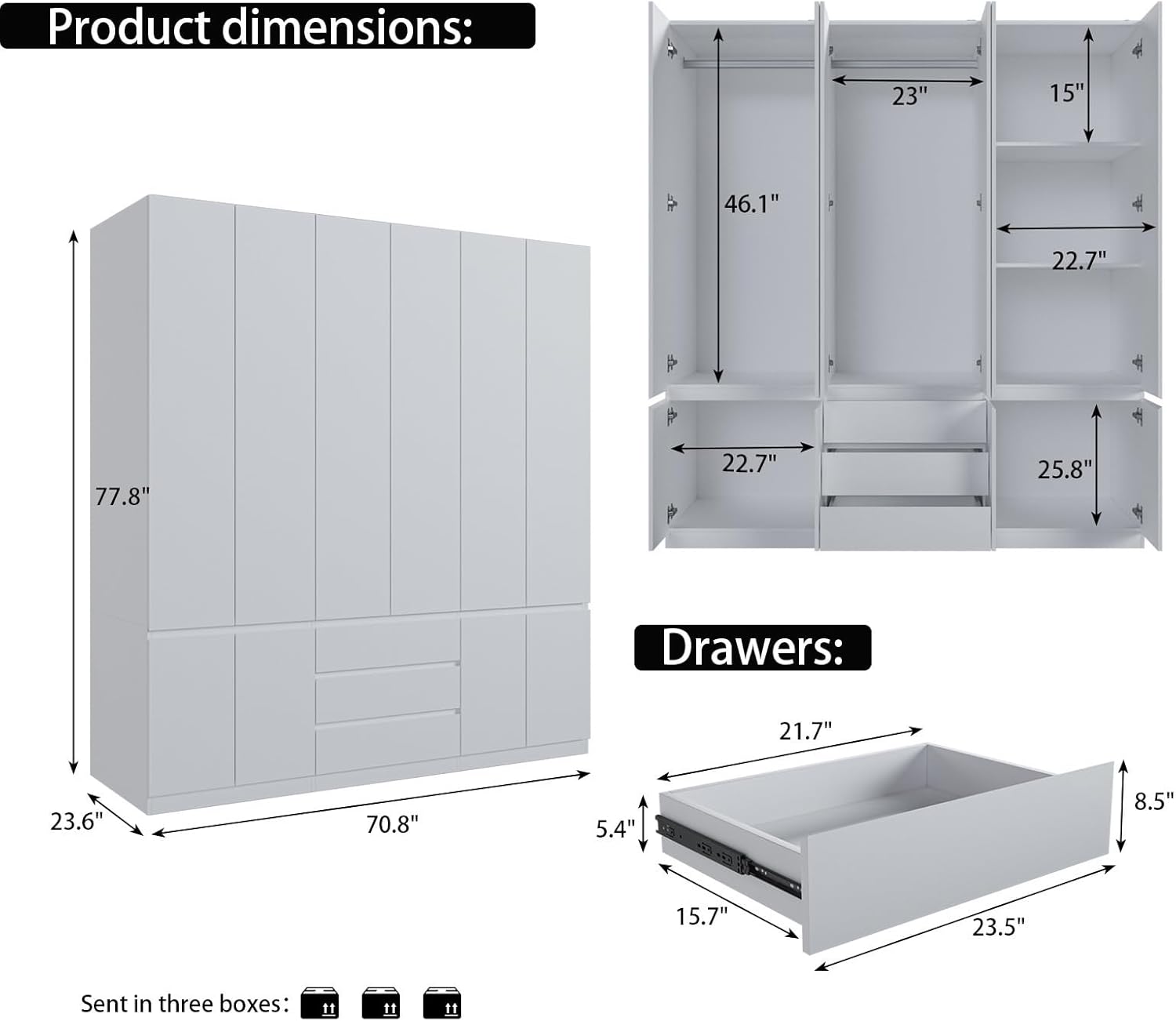 Large Armoire Wardrobe Closet with Drawers and Shelves, White Bedroom Armoires with 6 Doors 2 Hanging Rods, Wooden Freestanding Wardrobe Armoire for Bedroom Organizer,23.6″D x 70.8″W x 77.8″H