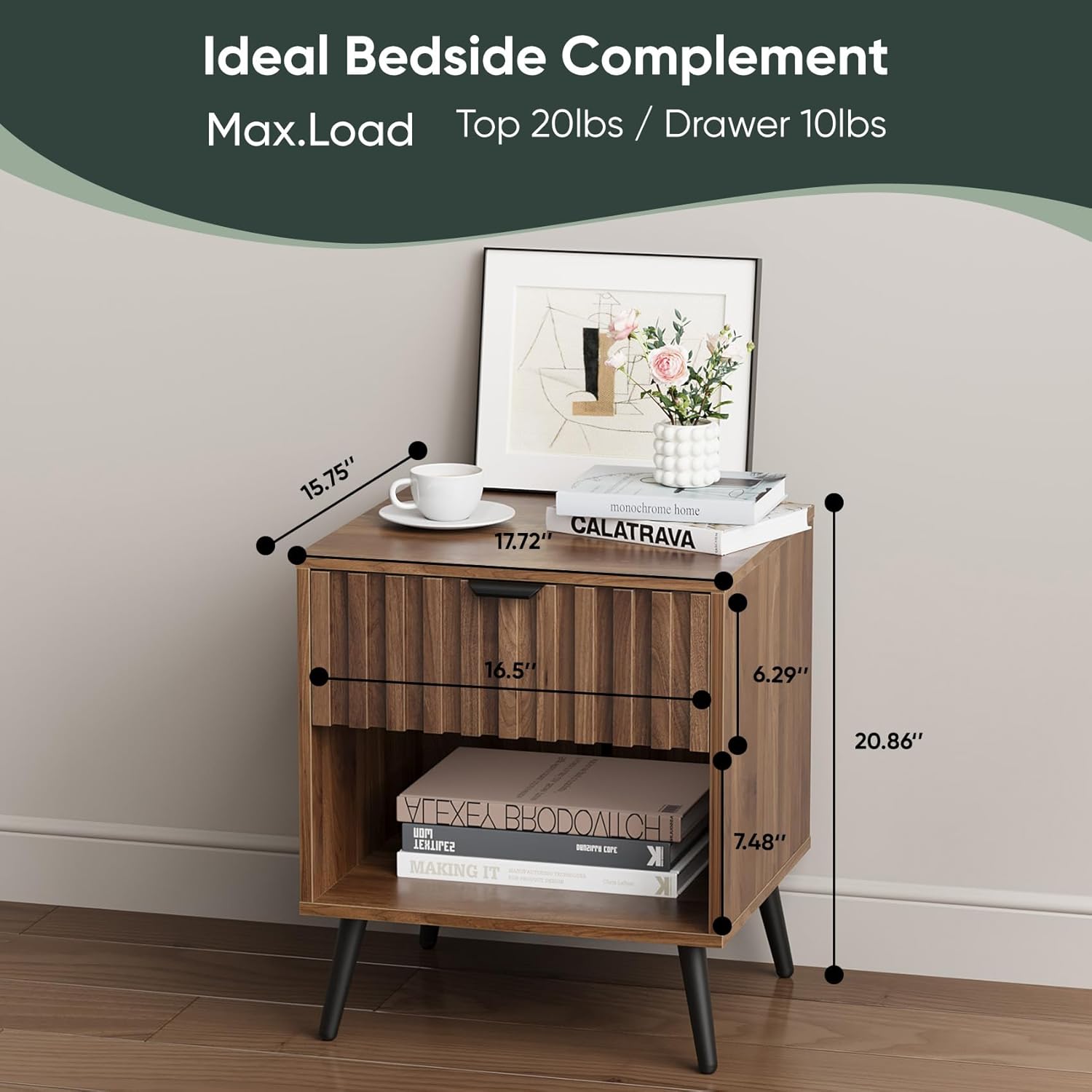 - Refined Design: This mid-century modern nightstand seamlessly combines rustic and contemporary elements. The walnut finish and fluted drawer design add style and character to any room, effortlessly blending with various home decor styles to bring an elegant and vintage look to your living room or bedroom.