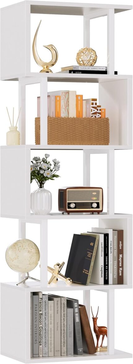 White Geometric Bookshelf 6 Tier S-Shaped Bookcase, Tall Modern Display Storage Shelf, Metal and Wood Decorative Freestanding Room Divider Shelves for Bedroom, Living Room, Office